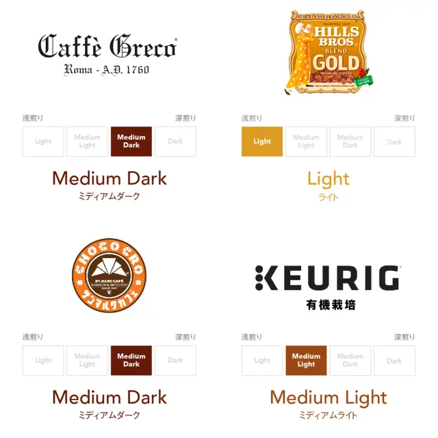 セット内容:KCUP(カフェインレス、カフェグレコ エスプレッソロースト、ヒルス ブレンドゴールド、サンマルクカフェブレンドコーヒー)