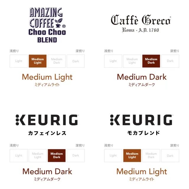 セット内容:KCUP(モカブレンド、カフェインレス、カフェグレコ エスプレッソロースト、AMAZING COFFEE Choo Choo BLEND)